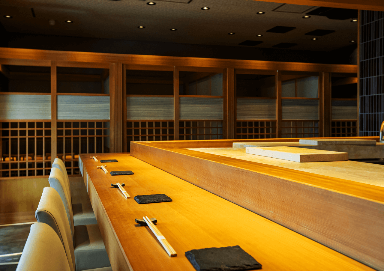 最大14席、白木のカウンターゆったりとした落ち着きを与え、リラックスしてお食事をお楽しみいただけます。