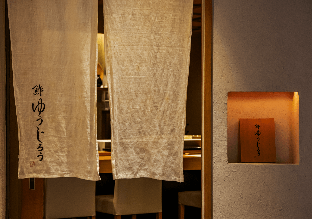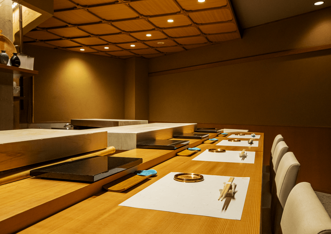 北新地のとあるビルの奥に進むとひっそりと看板が。白木のくの字カウンター、重厚な黒の付け台に砂壁が和の空間を演出。系列の中でもアッパークラス。妥協しない食材の仕入れと長時間の仕込みに人々が舌鼓を打つ。