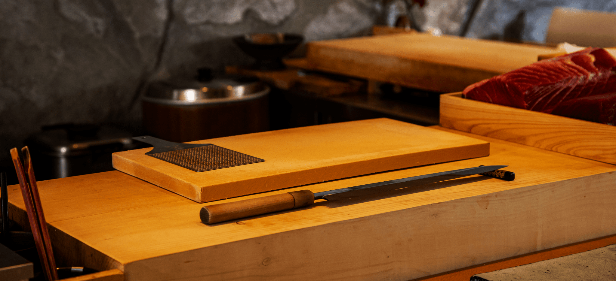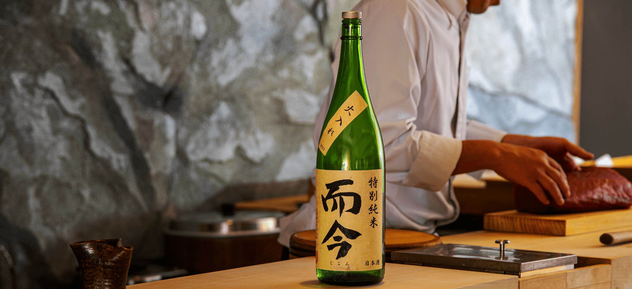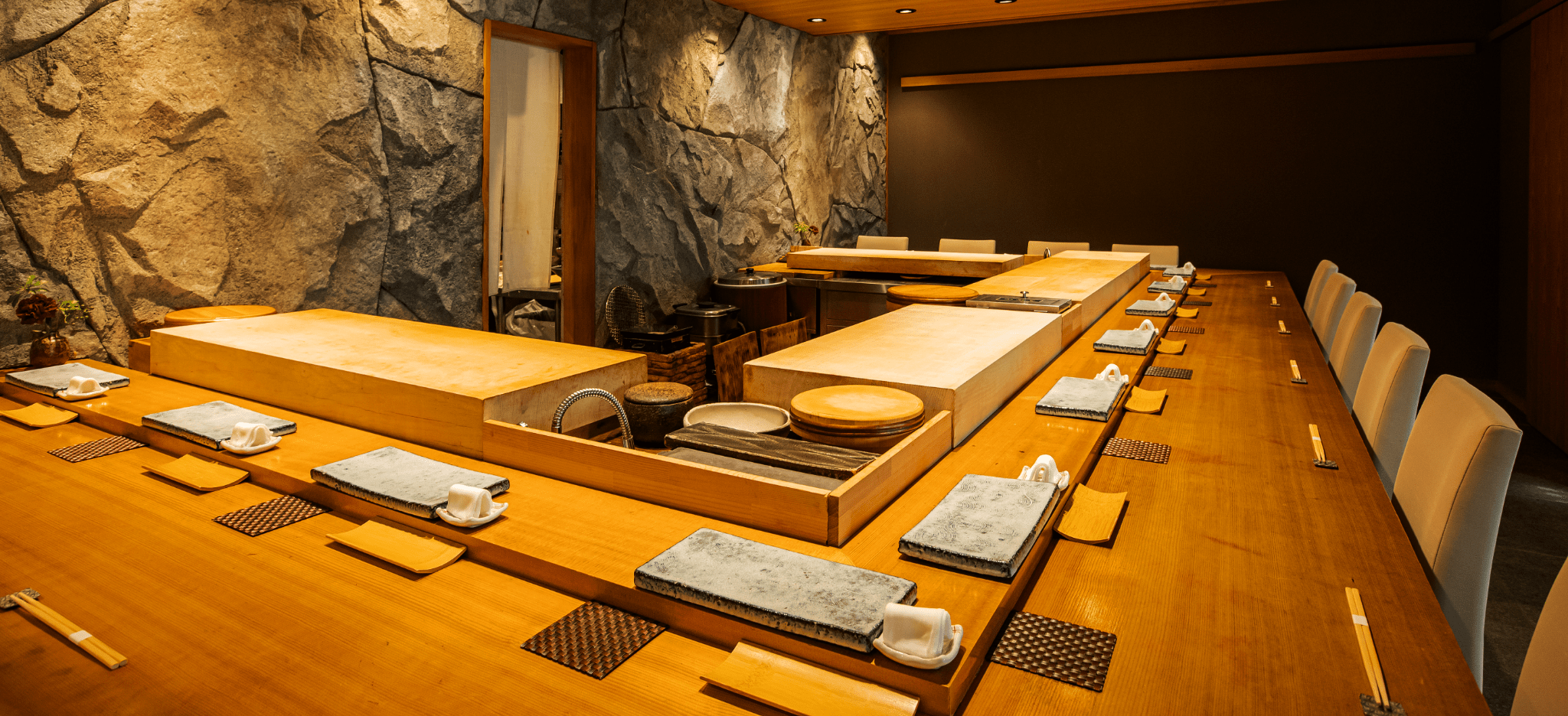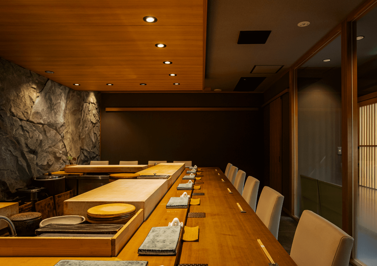 最大14席 白木を贅沢に使用し仕立てられたコの字カウンターの後ろには独特な石壁が聳える。炭の香り漂う空間で職人を目の前に非日常の体験を作り上げる。