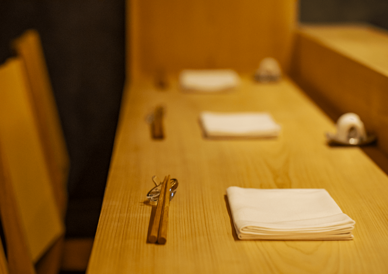 最大6席 少ない席数に力を注ぐ大将。一枚の檜のカウンターを仕立て、凛とした空間の中で職人やお連れ様との会話に花が咲く特別な時間を提供します。